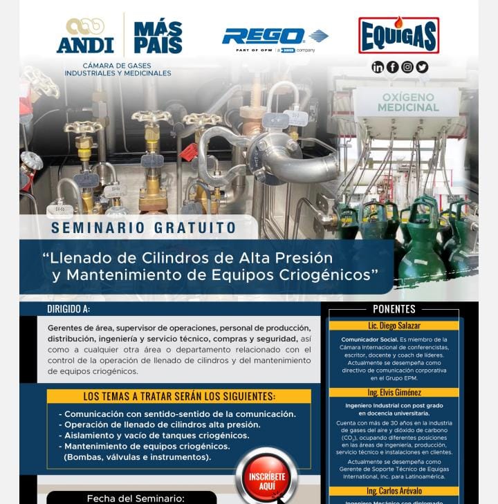 Bajo el título "Llenado de cilindros de alta presión y Mantenimiento de equipos criogénicos", se desarrollará el seminario gratuito, que es organizado por la Cámara de Gases Industriales y Medicinales de Colombia (ANDI), siendo la cita el próximo 14 de septiembre, en la ciudad de Bogotá.